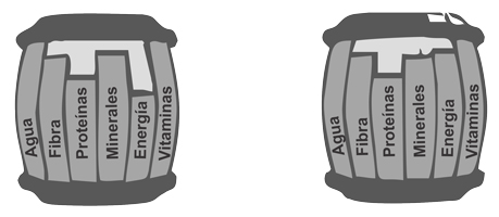 Es importante saber que los animales crecerán más o crecerán menos de acuerdo a la cantidad y proporción de alimentos que se les da. Es decir que; por ejemplo, si se les da mucha proteína y energía, pero hace falta fibra, los animales no crecerán bien. O sea que los animales crecen de acuerdo al nutriente que es limitante. Otro ejemplo: un barril que está hecho con tablas de diferente tamaño: